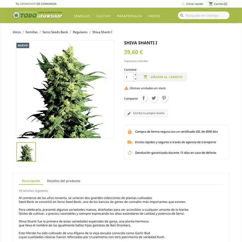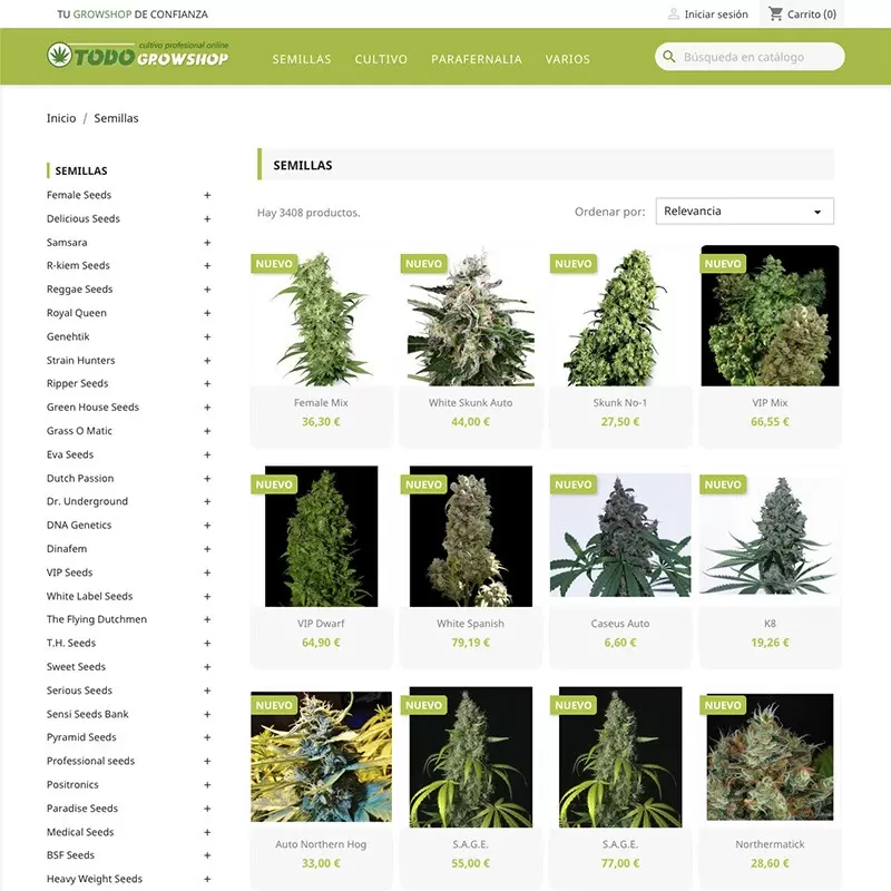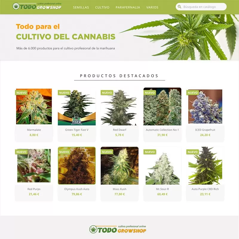 Vende un catálogo que incluye todo lo necesario para el autocultivo: fertilizantes, sustratos, iluminación, control del clima, parafernalia, macetas, sistemas de riego, cosecha, huerto urbano, etc.