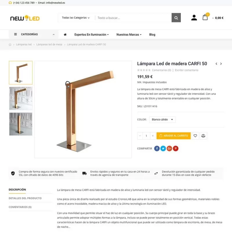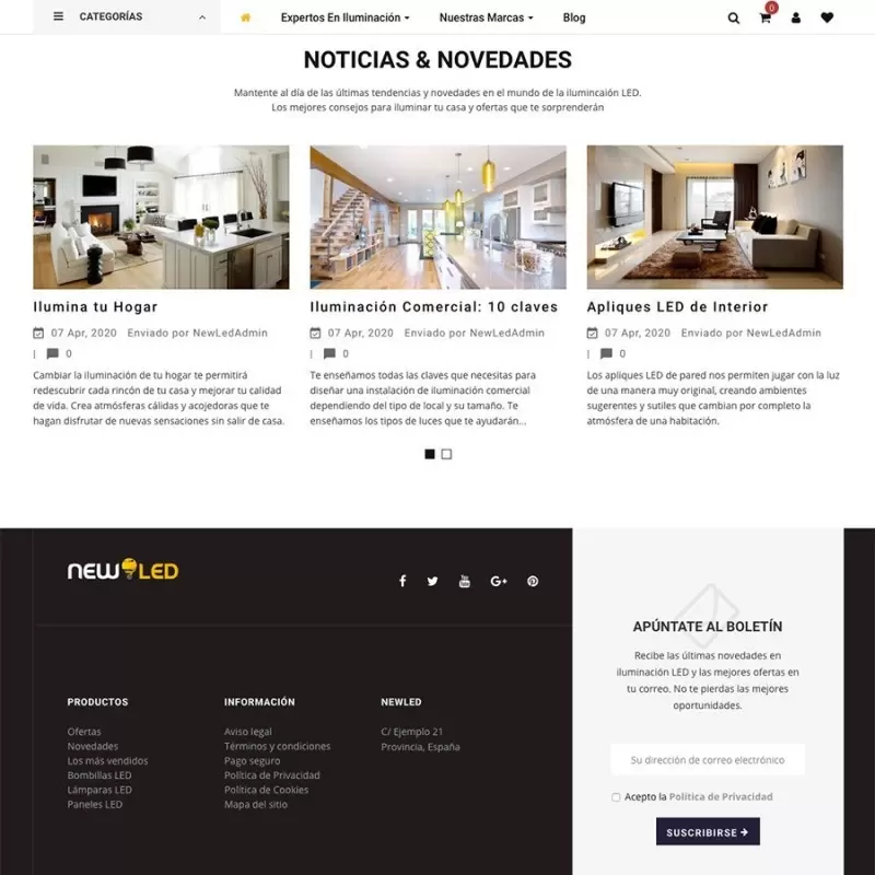 NewLED.es cuenta con un diseño premium con multitud de funcionalidades extra: buscador predictivo, blog integrado, bloques dinámicos en portada, sistema de comentarios, cuenta atrás en descuentos, doble imagen en cada producto, menú vertical y horizontal totalmente configurables, botón de siguiente producto y todo preparado para adaptarse a todos los tamaños de pantalla: ordenadores, portátiles, tablets, smartphones, etc.