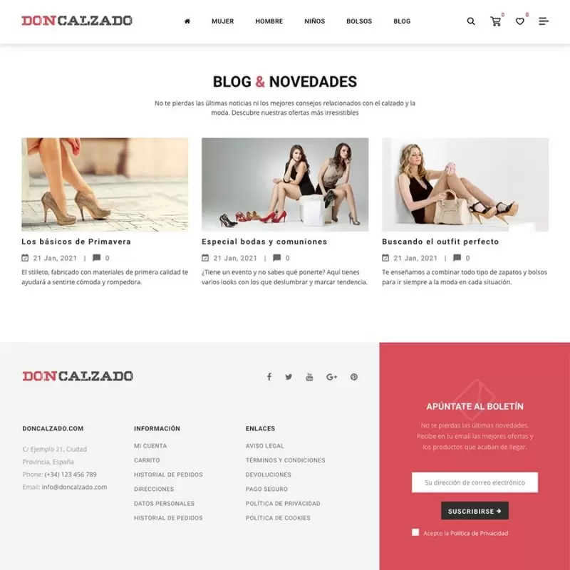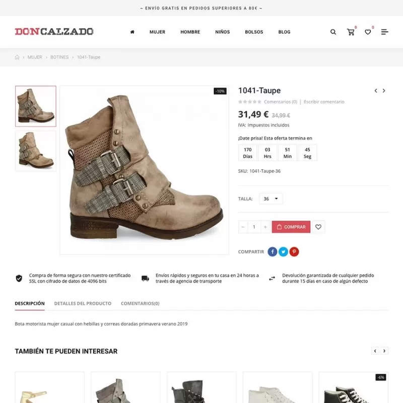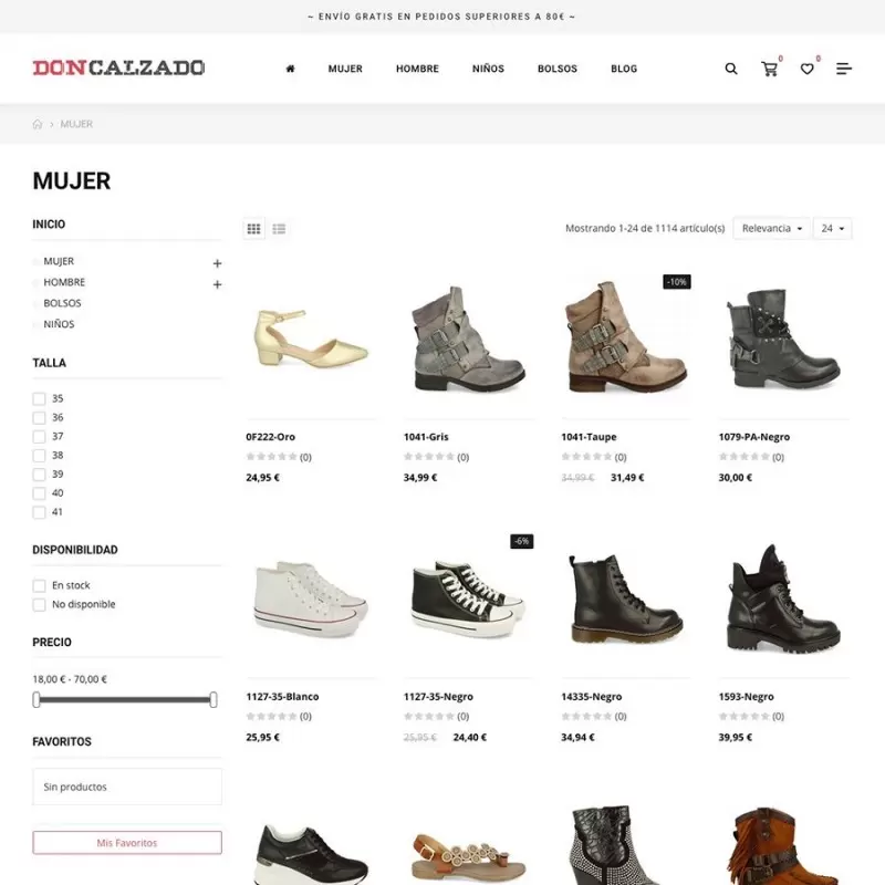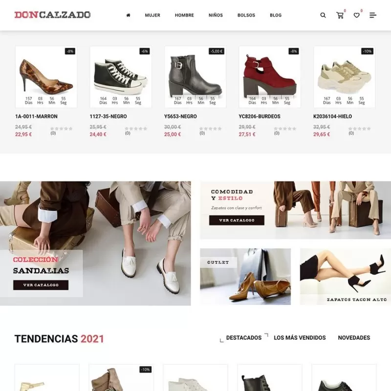 Con DonCalzado.com disfrutarás de un diseño premium con muchas funcionalidades extra: buscador predictivo, blog integrado, bloques dinámicos en portada, sistema de comentarios, cuenta atrás en descuentos, botón de siguiente producto y todo diseñado para visualizarse perfectamente en todo tipo de dispositivos: ordenadores, portátiles, tablets, móviles, etc.