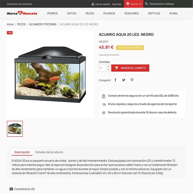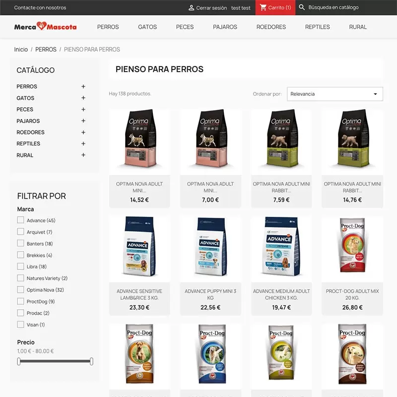 2. Diseño profesional y funcionalidad Creada por TiendaWebOnline.es, MercaMascota.com cuenta con un diseño moderno, atractivo y optimizado para ofrecer una experiencia de usuario impecable. La tienda está configurada, incluyendo la instalación métodos de pago seguros, integración con redes sociales y sincronización del catálogo automatizada.